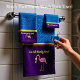 Personalisieren Sie romantische moderne Denim-Textur mit lila Hintergrund.und ein Bild eines rosa Flamingos stehend mit einer roten Bogen-Krawatte