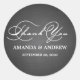 Romantisches Skript Vielen Dank Gastgeschenk Hochzeit Labels. Elke Clarke © Verfügbar unter www.zazzle.com/epclarke. Weißer Script-Schriftart auf schwarzem Chalkboard-Hintergrund (Printeffekt für Foto). Passen Sie Ihre Brautnamen und Bräutigam an und verbringen Sie Ihre Hochzeit. Ein einfaches, klassisches, traditionelles, vielseitiges Design für eine elegante Hochzeit oder romantische Hochzeit.
