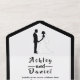 Diese elegante Schwarzweiß-Bogenhochzeit lädt zu einer modernen Hochzeit ein. Das einfache Design zeichnet sich durch eine elegante schwarze Kalligraphie und eine Braut- und Bräutigam-Illustration auf einem sauberen, weißen Hintergrund aus.