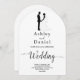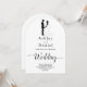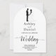 Diese elegante Schwarzweiß-Bogenhochzeit lädt zu einer modernen Hochzeit ein. Das einfache Design zeichnet sich durch eine elegante schwarze Kalligraphie und eine Braut- und Bräutigam-Illustration auf einem sauberen, weißen Hintergrund aus. Die Einladungskarte enthält die Hochzeitsdetails auf der Rückseite, anstatt für eine separate Kapselkarte zu bezahlen.