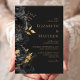 Diese düstere, launenhafte Hochzeitseinladung zeigt einen Rahmen aus schwarzen Blume, die mit goldenen Imitate-Foliage Set ablegen. Die Namen des Ehepaares erscheinen im klassischen, goldfarbenen Serif-Schriftart, der übrige Text kursiv auf einem schwarzen Hintergrund.