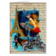 Hübsche weibliche romantische zeitgenössische Collage der Tänzer und des Mädchens herein mit dem Eiffel-Turm Paris Frankreich, Schmetterlinge und eine lustige Vintage Illustration des alten Buches steampunk Autos mit einem indischen Leiter, der romantische rote Liebeherzballone auf einem Blau hält, beunruhigten Hintergrund mit einem alten handgeschriebenen Buchstabetext. Fertigen Sie diesen Entwurf besonders an, indem Sie Ihren eigenen Text addieren.