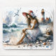 Eine ruhige Aquarellfarbe an der Küste, die eine barfuß Frau in einem fließenden Kleid in der Nähe des Meeres gefangen nimmt, umgeben von Muscheln, einem Korb aus Garn und einem überwachten Leuchtturm. Die Szene verbindet sanfte Ozeanfarben mit zarten Farbtupfern und schafft einen traumhaften Moment der Reflexion, der windgewitzten Schönheit und der Ruhe am Meer. Das perfekte Bild für jeden, der zu romantischem Küstenleben, ruhiger Kraft und Geschichtenbuch-Einfachheit gezeichnet hat. AI generierte Kunstwerke.