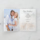 Schöne Säulen mit eleganten Aquarellfarben, rosa Rosen und grünem Blattwerk auf einem subtilen pastellfarbenen Aquarell und mittelem Etikett mit goldenen Rahmen. Verfügt über kalligraphische Textgrafiken im benutzerdefinierten Skript-Schriftart (oder löschen und anpassen im Design-Editor) mit bearbeitbaren Textfeldern für Ihre Zeremonie Details und Hochzeitsteilnehmer. Im Inneren gibt es auch eine optionale Fotovorlage.