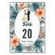 Diese elegante, Aquarellblütenhochzeit-Tischnummer eignet sich ideal für eine moderne Hochzeit. Das romantische Design besticht durch einen eleganten, floralen Aquarellrahmen mit einer Braut- und Bräutigrade und einer schwarzen Kalligraphie auf weißem Hintergrund.