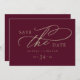 Diese romantische bordeauxrote Kalligraphie QR Code horizontal Save the Date Karte ist perfekt für eine einfache Hochzeit. Das moderne klassische Design besticht durch extravagante Wirbel und skurrile Schnörkel mit herrlicher eleganter, handgezeichneter Imitat-Champagner-Goldtypografie. Bitte beachten Sie: Dieses Design enthält keine echte Goldfolie. Es ist eine hochwertige Grafik, die wie Goldfolie aussieht.