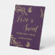 Romantischer lila Hochzeitstisch mit Goldblüte Lec Sockelschild