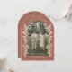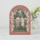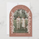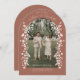 Es handelt sich um eine elegante, bogenförmige Save the Date-Karte mit einem romantischen Terrakotta-braunen, erdigen Farbschema. Das Design zeigt ein individualisierbares Foto eines verlobten Paares, das in der Mitte positioniert ist, umgeben von zarten, blühenden Ästen und kleinen Blüten, die einen schönen Rahmen um das Bild herum schaffen. Die Ästhetik ist weich, romantisch und raffiniert, die Blumenelemente fügen dem klassischen Bogendesign eine skurrile Touch hinzu, die sich perfekt für eine Frühjahrs- oder Gartenhochzeit eignet.