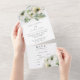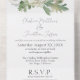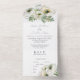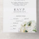 Diese romantische, blumengeschmückte Hochzeitseinladung zeichnet sich durch ein durchgängiges Design mit einer am Ende enthaltenen R.S.V.P.-Karte aus. Der Hintergrund ist schlicht und elegant, mit Aquarellfarben-Ranunculus-Blume. Auf der Vorderklappe wird ein zartes Bouquet aus Ranunculus und Grünpflanzen abgebildet, zwei auf dem inneren Teil.