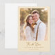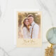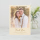 Diese Hochzeits-Dankeskarten haben ein klassisches und romantisches Design mit einem weichen beigen Hintergrund, das eine elegante und einladende Atmosphäre schafft. Das Layout enthält oben einen großen Platzhalter für ein Foto, der einen warmen, natürlichen Moment einfängt, während unten die kursiven Schriftzüge für "Danke" mit sauberen Serifenschriften für Namen und Ort kombiniert werden, was Raffinesse und Klarheit verleiht. Der Gesamtstil ist zeitlos und herzlich, perfekt, um nach Ihrem besonderen Tag Dankbarkeit auszudrücken. Mit ihrer einfachen und dennoch raffinierten Ästhetik sind diese Karten ideal für Paare, die Wert darauf legen, ihre Wertschätzung auf persönliche und stilvolle Weise auszudrücken.