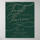 Dieses romantische Grün und Gold morgen mache ich Probe Dinner Plakatzeichen ist perfekt für eine einfache Hochzeit. Das moderne klassische Design besticht durch extravagante Wirbel und skurrile Schnörkel mit herrlich eleganten, handgezeichneten Imitaten, die auf einem dunkelgrünen Hintergrund mit Champagner-Goldfolie-Typografie versehen sind. Auf dem Schild steht: "Heute feiern wir mit Ihnen, morgen sagen wir, ich tue". Bitte beachten Sie: Dieses Design enthält keine echte Goldfolie. Es ist eine hochwertige Grafik, die wie Goldfolie aussieht.