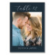 Diese Hochzeitstischkarte verfügt über ein romantisches und intimes Design mit einem rechteckigen Layout, das in zwei Abschnitte unterteilt ist. Der obere Abschnitt hat einen tiefblauen Hintergrund mit eleganter Schreibschrift für die Tischnummer, während der untere Abschnitt ein Foto eines Paares mit Weichzeichner-Effekt zeigt, das von derselben blauen Umrandung eingerahmt wird. Unter dem Foto werden anpassbare Namen in sauberer, sans-serif-Schrift angezeigt. Die warmen Töne des Fotos kontrastieren schön mit dem kühlen blauen Hintergrund und schaffen eine elegante und dennoch einladende Atmosphäre, die perfekt ist, um die Liebe auf Ihrem besonderen Ereignis zu feiern.