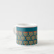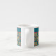 Eine stilvolle Espresso-Tasse mit kleinen grünen und roten Herzen auf einem aquamarinen Hintergrund. Sie können dem blauen Band einen Namen oder Text hinzufügen, wenn Sie möchten. Alternativ verlass es schlicht.