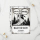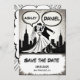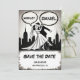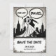 Diese elegante Schwarzweiß-Comic-Hochzeitsfeier im Buchstil bewahrt die Dattelkarte für eine moderne Hochzeit. Das schlichte Design zeichnet sich durch eine elegante schwarze Kalligraphie und eine Braut- und Bräutigam-Illustration auf einem Comic-Buchhintergrund aus.