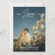 Doppelseitige Save the Date-Karte mit einem romantischen Typografie-Design, das sich auf den Hochzeitstag auf einem Foto des glücklichen Paares konzentriert. Fügen Sie drei weitere Fotos auf der Rückseite in einer sauberen Collage zusammen mit einem QR-Code auf Ihrer Hochzeitswebsite hinzu. Save the Date Vorlagenkarte personalisiert mit Fotos.