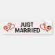 Romantischer verflochtener Herz-Muster-gerade verheirateter Autoaufkleber. Zwei überschneidene rote Rolleherzen verankern jedes Ende, um die Gewerkschaft der Braut und des Bräutigams darzustellen. Gerade verheiratet wird in schwarze Beschriftung in der Mitte über einem sehr hellrosa Herzmusterhintergrund geschrieben. Die Mitteilung ist eine große Weise, weg von den eben verheirateten Paaren nach dem Hochzeits-Empfang zu senden. Behalten Sie, wie ist oder löschen Sie den rosa Hintergrund, wenn Sie gerade einen einfachen schlichten weißen Hintergrund bevorzugen.