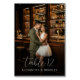 Diese Hochzeitstischkarte zeigt eine romantische Szene in einer eleganten Bar, in der sich zwei Personen warm umarmen. Das Design zeigt eine gut sortierte Bar, die von sanfter Beleuchtung erhellt wird und eine gemütliche und einladende Atmosphäre schafft. Die Farbpalette umfasst warme Töne von tiefem Braun und Bernstein, die durch die hellere Kleidung des Paares kontrastiert werden. Die Typografie am unteren Ende hebt "Tisch 12" in einer fließenden Schreibschrift hervor und verleiht dem Gesamtdesign einen Hauch von Raffinesse. Perfekt, um die Stimmung auf Ihrer besonderen Feier zu bestimmen, verbindet diese Karte Romantik und Eleganz nahtlos.