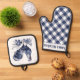 "Rooster" Blue Willow Style Custom Oven Mitt & Pot Holder Set. Das wunderschöne Set mit Mitt und Topfhalter aus Kochofen mit einem zauberhaften blauen Hahn mit Blume auf weißem Hintergrund auf dem Topfhalter und einem Gingham-Muster auf dem Ofen-Mitt. Inspiriert durch die Farbpalette und den Stil des Willow Blue China, verleiht dieses Stück jedem Küchendekor eine Touch von Charme und Eleganz. Was dieses Produkt auszeichnet, ist seine Anpassungsoption, die es Ihnen ermöglicht, es mit Ihrem Namen oder dem Namen eines geliebten Menschen zu personalisieren, was es zu einem nachdenklichen Geschenk macht. Um Ihr Küchensemble zu komplettieren, bieten wir Ihnen koordinierende Produkte wie ein Schneidebrett, Küchentücher sowie eine Wanduhr und eine Kaffee/Tee Tasse. Das Beste? Die Wandkunst, die Kaffee/Tee-Tasse, das Schneidbrett und der Ofen-Mitt können Sie ganz nach Ihren Wünschen gestalten.