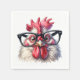 Cartoon-Hahn mit übergroßen, schwarz gerippten Gläsern auf weißem Hintergrund.