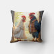Ein Hahn und eine Henne in menschenähnlichen Kleidungsstücken stehen sich gegenüber und haben ein Ei zwischen ihnen in einer Scheune, das durch Sonnenlicht filtert