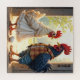 Ein Hahn und eine Henne in menschenähnlichen Kleidungsstücken stehen sich gegenüber und haben ein Ei zwischen ihnen in einer Scheune, das durch Sonnenlicht filtert