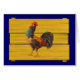 Ein farbenfroher Crowing-Hahn aus Vintagem Küchenkasten-Label-Kunstwerk auf Holzschild-Hintergrund. Klicken Sie auf Anpassen, um Ihren Namen oder Ihre Nachricht hinzuzufügen.