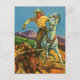 Farbenfrohe Abbildung eines Cowboys auf einem Pferd, der eine Lenkung anzieht. Aus dem Cover eines Vintagen Comic