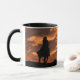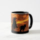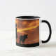 Roping Cowboys bei Sonnenuntergang. Zwei silbrige Cowboys in einem feurigen Sonnenuntergang jagen auf der Jagd nach dem letzten Ruder. Das ist eine großartige Cowboy-Kaffeetasse für Western.