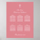 Pink 6 Table Christening Seating Chart Poster, ein hübsches Plakatposter mit weißem Kreuz und elegantem weißem Text auf einem schönen, rot-rosa Hintergrund. Bitte personalisieren Sie den Namen der getauften Person und die Namen der Gäste zusammen mit einem anderen Text, den Sie möglicherweise personalisieren möchten, indem Sie die Online-Personalisierungsvorlage vor der Bestellung verwenden.