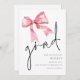 Rosa Abschluss Grad Save the Date. Dieses Design hat einen schwarzen Coquette-Bogen zu top links und informellen Set Handschrift Stil Skript für den Haupt-Header, Grad, und leicht zu personalisieren Typografie auf der unteren rechten Seite mit Ihren Details.