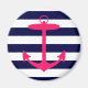 Eine helle, neonrosa Silhouette eines Ankeres befindet sich auf einem marineblau-weiß gestreiften Hintergrund. Ein lustiges, nautisches Design.
