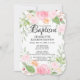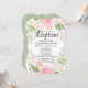 Schöne Taufe Einladung für ein Mädchen. Die rosa Aquarellfarben vermischen sich mit verschiedenen grünen Blätter, um eine Blumenausstellung zu schaffen, die die Einladung abkaskadiert. Die Taufe ist in einem großen Skript-Schriftart geschrieben. Der Rest des Vorlagentextes wird in einem einfachen und sauberen Schriftart geschrieben. Sehr einfach zu anpassen. Die Rückseite der Taufeinladung ist Salbei grün mit einem sehr subtilen Blatt Muster.