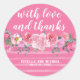 Schöner Aufkleber für Ihre Gastgeschenke Hochzeiten und danke Ihnen Notizen. Schöne Aquarellfarben rosa Blume und Streifen schaffen eine moderne Hochzeit dank Aufkleber. Die obere Hälfte des Aufklebers ist massiv rosa. Die untere Hälfte ist freehand gezeichnet rosa Streifen. Eine wunderschöne Ausstellung von Aquarellfarben-Blume und ihrer Vegetation ist in der Mitte, wo sie sich treffen. Mit Liebe und Dank ist in einem fließenden weißen Skript auf der oberen Hälfte geschrieben. Die Namen der Hochzeitspaare und die Hochzeitsdaten befinden sich in der unteren Hälfte.