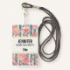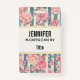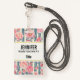 Ein Namensschild mit einem wunderschönen Muster mit hübschen rosa Blume, die über einem gestreiften Muster aus blauen und cremefarbenen Streifen angeordnet sind. Ein Rechteck mit einem Imitat mit einem goldenen Rahmen, der oben platziert ist und in dem sich der personalisierte Text befindet.