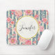 Ein wunderschönes Mousepad mit hübschen rosa Blume, das über einem Streifen mit blauen und cremefarbenen Streifen liegt. Ein Rundrahmen mit einem Imitat mit einem vergoldeten Folienrahmen oben und dem personalisierten Namen und Monogramm.