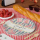 Brautparty-Papier-Teller mit einem wunderschönen Muster mit hübschen rosa Blume überlagert über einem gestreiften Muster, das aus blauen und cremefarbenen Streifen besteht. Ein Rechteck mit einem Imitat mit einem goldenen Rahmen, der oben mit dem personalisierten Text überlagert ist.