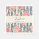 Papierservietten mit einem schönen Muster mit hübschen rosa Blume, die über einem gestreiften Muster aus blauen und cremefarbenen Streifen liegen. Ein Rechteck mit einem Imitat mit einem goldenen Rahmen, der oben mit dem personalisierten Text überlagert ist.