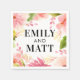 Spezielle Hochzeitsnapkins sind mit schwarzem, benutzerdefiniertem Text versehen, der mit den Braut- und Bräutigamen personalisiert werden kann. Die Blume besteht aus einem wunderschönen, blumengeschmückten Kronenrahmen mit pastellrosa, rot und pfirsichfarbenem Frühling und Sommerdahlia und Rose.a