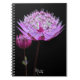 Ein individuelles, spiralgebundenes Notebook, das das Cover-Foto eines rosa Astrantia Blume-Set vor einem kontrastreichen, schwarzen Hintergrund zeigt. Auch bekannt als Masterwort und Hattie's Pincushion. Ein atemberaubendes Blumenbild! Als Tagebuch oder zum Mitnehmen von Notizen.