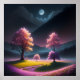 Willkommen im Pink Aurora Forest, einem anderen Weltreich, in dem üppige Alien-ähnliche Bäume mit lebhaften rosa Blätter in faszinierender Pracht stehen. Unter dem sanften Mondlicht erwacht der Wald mit einer ätherischen Schönheit, umgeben von weit entfernten Bäumen und majestätischen Bergen. Generiert mit Unterstützung der KI