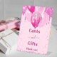 Ein Party-Tischschild für Karten und Geschenke. Modernes pastellrosa Ambiente mit eleganten Imitaten, Glitzern, pastellrosa und heiß rosa Ballons. Rosa Buchstaben.