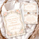 Eine romantische Mischung aus zarten rosa und pfirsichfarbenen Rosen, arrangiert in geschnitztem elfenbeinfarbenem Schnörkelwerk, schafft einen eleganten barocken Rahmen mit zeitloser Anziehungskraft. Zarte Lavendelsprösslinge und gedämpfte Grüntöne fügen Tiefe hinzu, während sie die Farbpalette luftig und raffiniert halten. Die warme goldene Typografie ergänzt die floralen Töne und verleiht dem Design einen grazilen europäischen Charme. Perfekt für eine klassische, feminine Feier mit luxuriöser und dennoch sanfter Ästhetik.