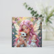 Eine hübsche rosa Anime-Elfenfee, die ihre süße weiße Baby-Drachen-Geburtstagskarte hält.