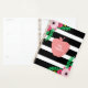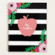 Ein Lehrer-Planer, der eine Abbildung eines rosa Apfels auf einem schwarz-weiß gestreiften Hintergrund zeigt. Blumendesigns oben links und unten rechts. Personalisieren Sie mit Ihrem Namen auf der Vorderseite.