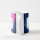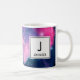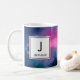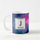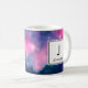 Eine Tasse mit einem schönen abstrakten Design in Rosa und Blau. Weiße Sterne sprengen durch dieses Bild des Kosmos. Trippig und cool. Ein weißes Quadrat mit einem schwarzen Rand oben mit dem Initial und Namen des Monogramms.