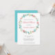 Eine helle und farbenfrohe Brautdusche lädt zum Frühling oder zur Sommersaison ein. Der blumengeschmückte Kranz im bohenhaften Stil ist in Rosa, Blau und Grün gehalten. Ihr benutzerdefinierter Text in der Mitte ist weich grau und passend Rose pink. Zusätzlicher Text ist in Grautönen unterhalb des Kranzbildes. Bild und Text werden auf einem weißen Hintergrund platziert. Die Rückseite der Einladung ist solide passend blau, wodurch ein schöner Farbspritz entsteht.