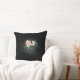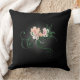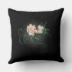 Ein quadratisches Kissen mit einer Illustration einiger zarter, rosa blühender Blume mit grünen Schlingen und Blätter auf schwarzem Hintergrund, mit etwas hellgrauem Schatten um die Blume, um zu betonen und zu beleuchten.