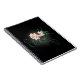 Ein Notizbuch mit einer Illustration von zarten, rosa blühenden Blume mit grünen Swirbeln und Blätter auf schwarzem Hintergrund mit etwas hellgrauen Schatten um die Blume zu akzentuieren und zu beleuchten.
