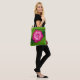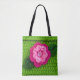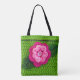 Das grüne und rosa Blumenbild, das auf der Totentasche gedruckt ist, stammt aus einem Foto eines originalen, gekreuzten Schaffens, das handgefertigt wurde und Copyright © des publizierten Designers Delores Chamblin. Auf der Tasche wird das Bild der einzigartigen handgefertigten Blume und Blätter mit sichtbaren Nähten und Perlknopfdruck wiedergegeben.