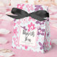 Eine Hochzeit danke Ihnen Geschenktasche, aber auch großartig für andere Anlässe mit einem niedlichen Blumenmuster. Besteht aus rosa und lila unregelmäßigen Blume in einem Retro-60er-Groovy-Stil. Oft verblasste kleine blaue Herzen, pfeffern Sie den Hintergrund auf einem blass blauen Hintergrund. Vielen Dank, dass Sie in einem trendigen Schriftart in einem cremefarbenen Quadrat mit rosa Rahmen geschrieben haben.